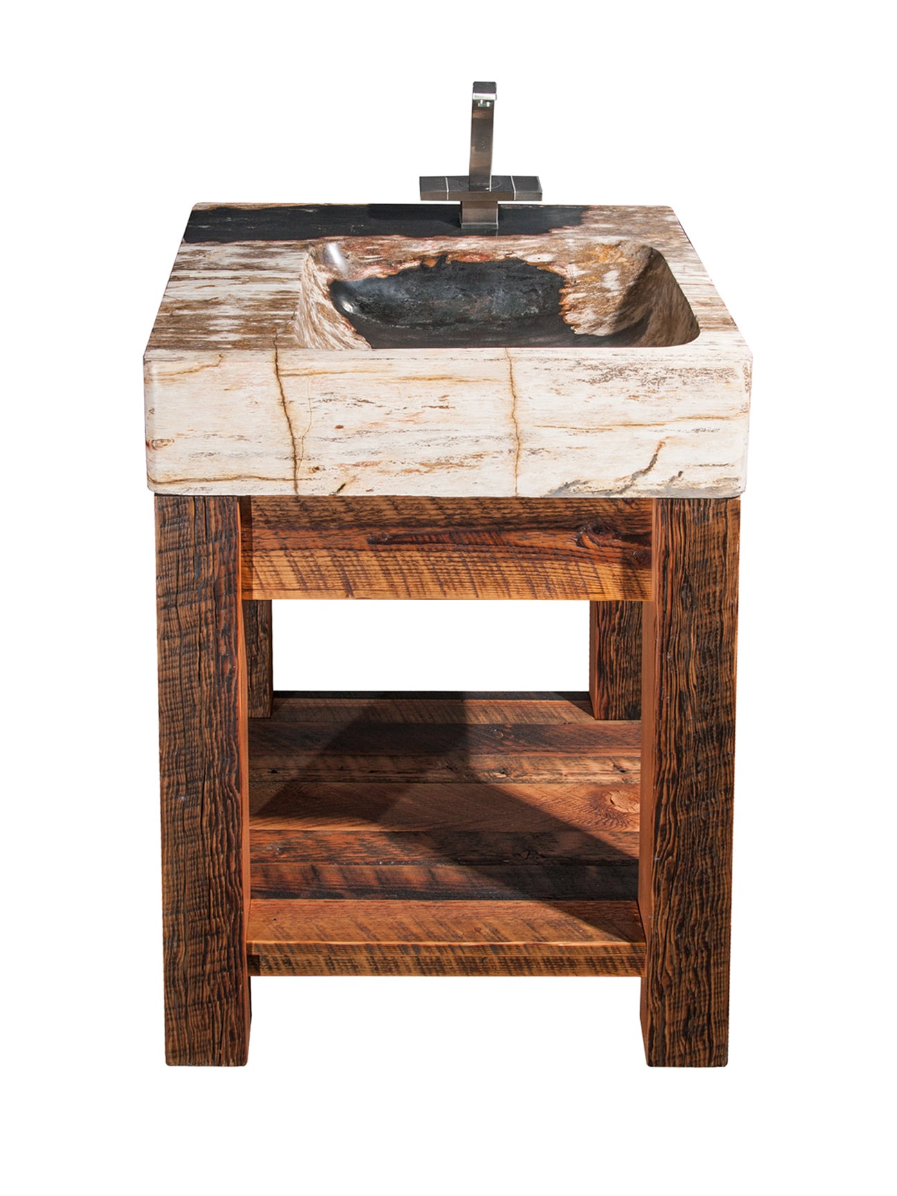 The massive 6″ stone top is in petrified wood. The back of the sink has a cut-out section to accommodate the plumbing requirements. A single faucet hole for a vessel faucet is cut on the back edge of the sink (faucet not included). Made by nature and quarried from the south pacific region, these sinks are carved from a single piece of wood turned to stone. A beautiful unique sink in a variety of shapes and sizes. Photos are the actual sink. Real wood cabinet made from solid barnwood. The actual color may vary slightly depending on your computer/screen. Sinks are box crated, we recommend having a forklift or to a commercial address with a dock.
