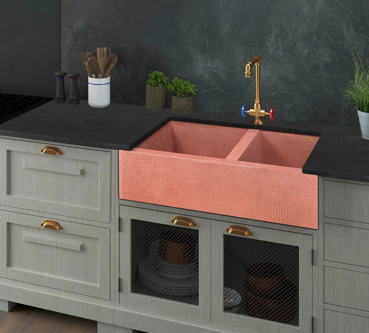 Our Classic Copper Farmhouse Sink is a great choice for any kitchen. The stylish Farmhouse style and split bowls provide a strong and elegant design. The copper finish is durable yet timeless, offering a sophisticated look that is sure to last. Need help deciding? Let us know!