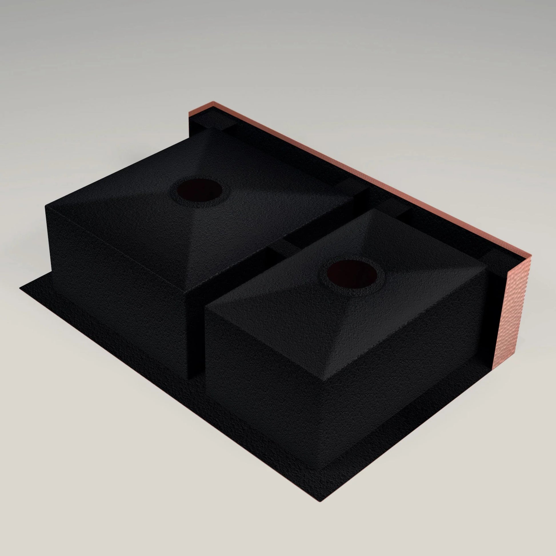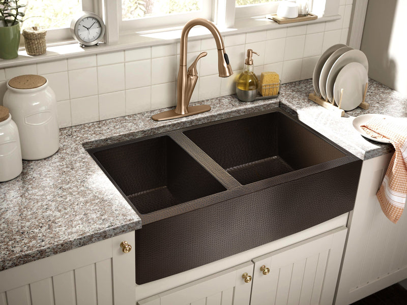 Classic style farmhouse sink with split bowls to help washing and draining. This copper sink has deep bowls and your choice of 33 or 36 inch wide. Farmhouse sinks have been around for years and with a flat apron front, you will be able to stand over the bowl closer making washing dishes comfortable. Let us know which side you want the 60/40 split on. Shown in order (Dark, installed, Natural, and Matte. See Copper Colors here