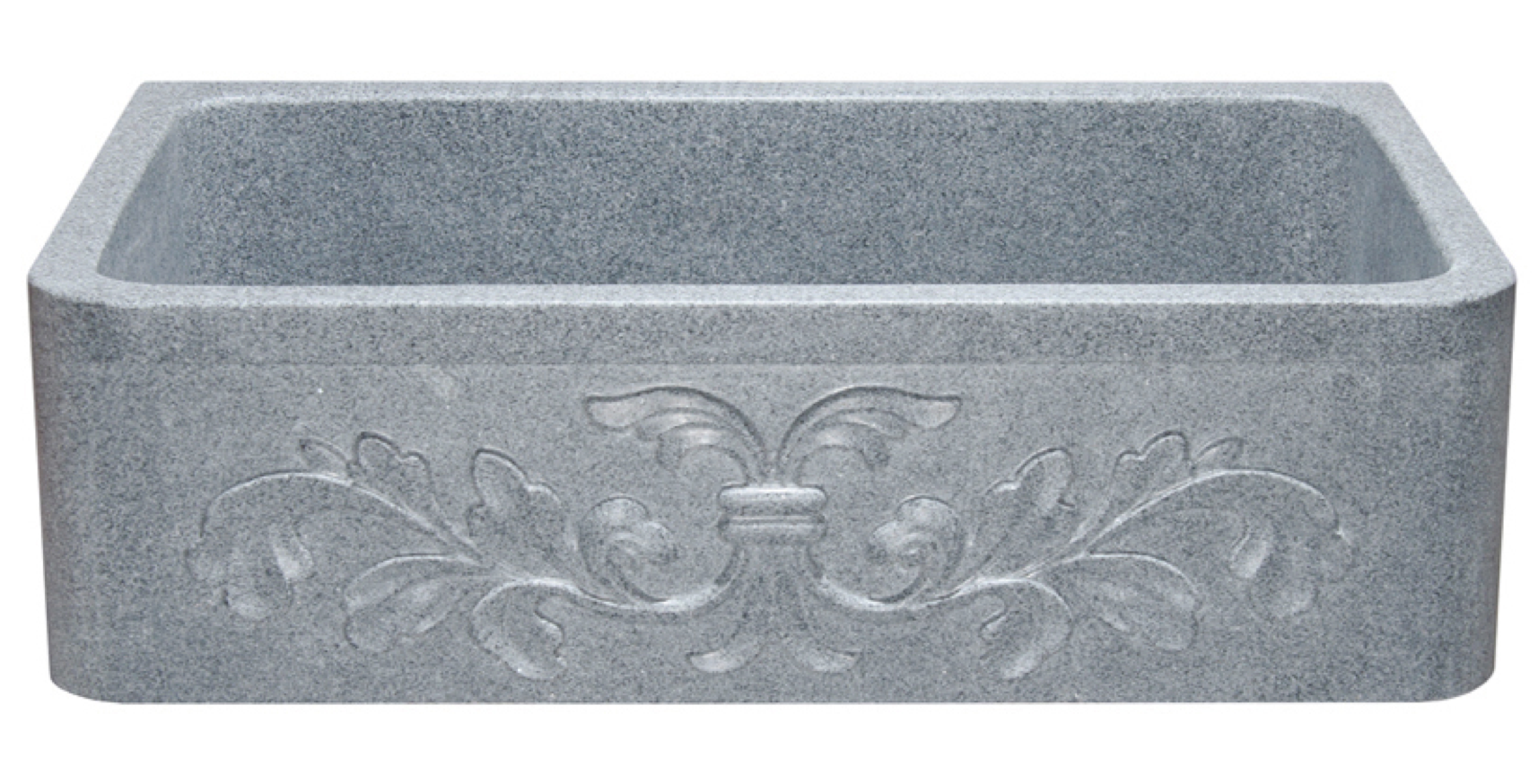 A single 33" bowl shows a beautiful floral front carving in mercury grey. A best seller, this sink is also available in black granite stone. The look is elegant! With a fine to medium grain, this hard-dense stone has a muted liquid mercury color, which complements most modern grey and white kitchens.