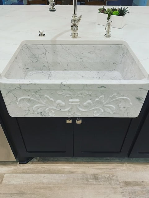 Transform your kitchen into a masterpiece with this breathtaking 33" farmhouse sink, hand-carved from premium Italian White Carrara marble. The ornate floral-carved front panel showcases Old World craftsmanship, while natural grey veining ensures each sink is a unique work of art.