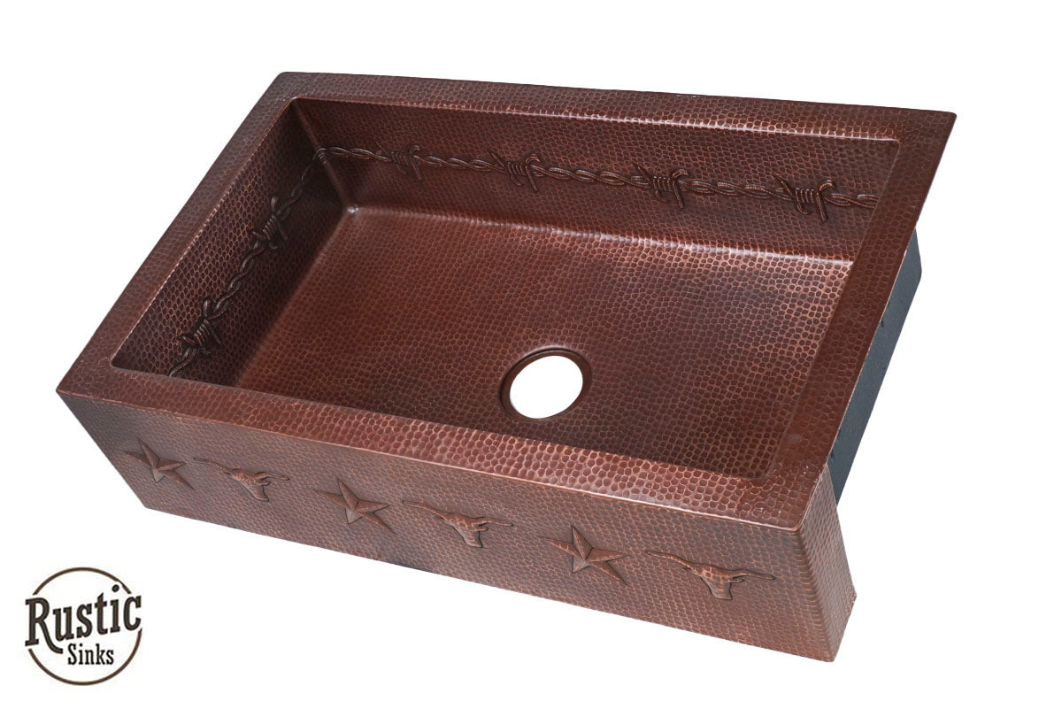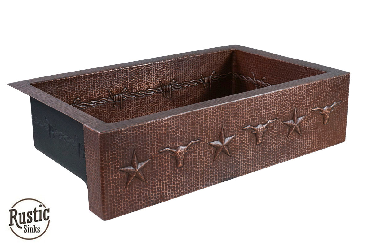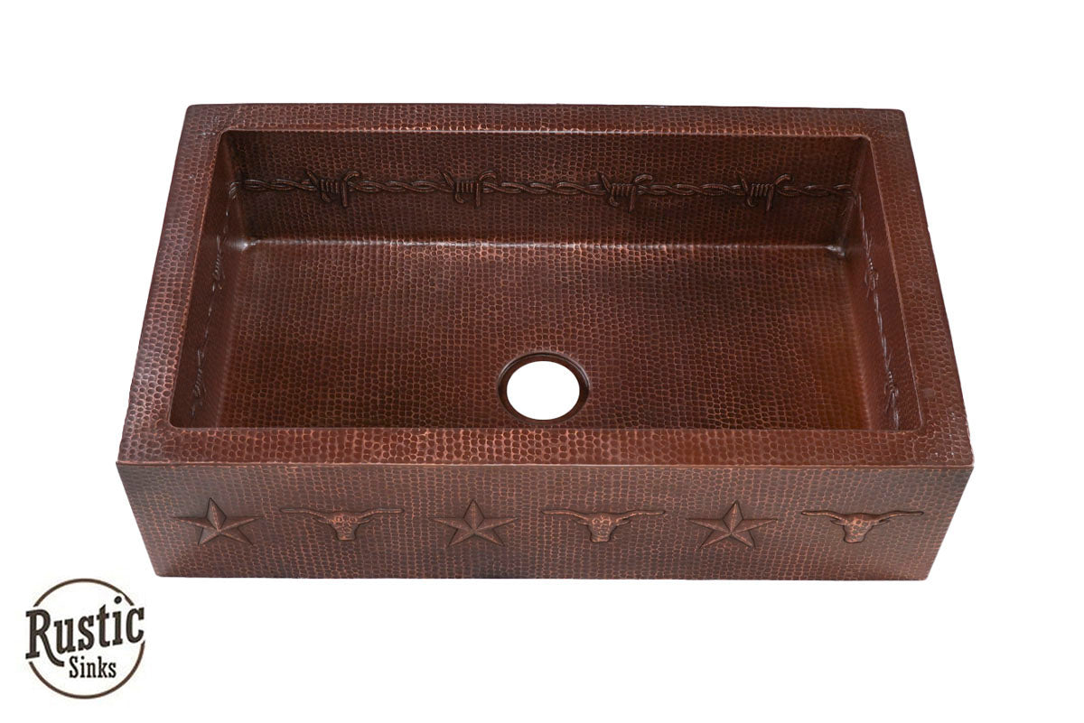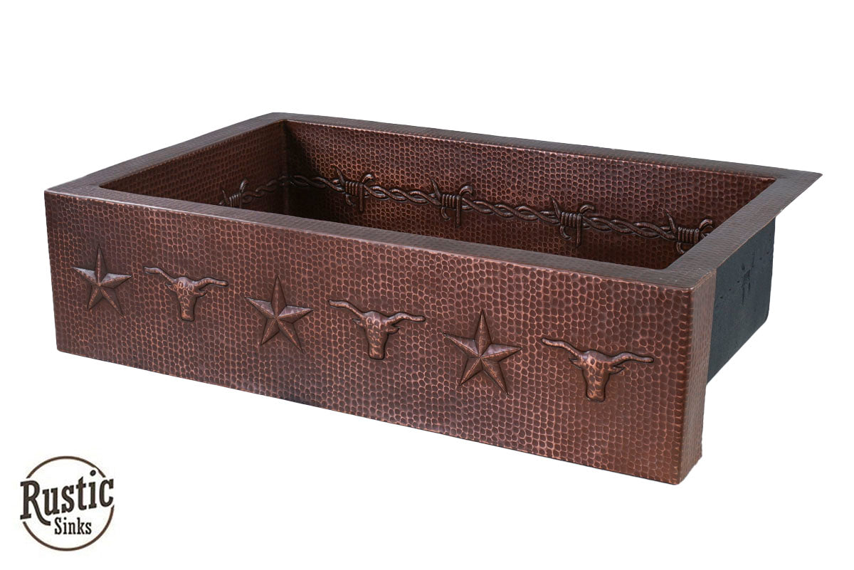 Copper Farmhouse Sink w/Barbwire, Stars & Longhorn