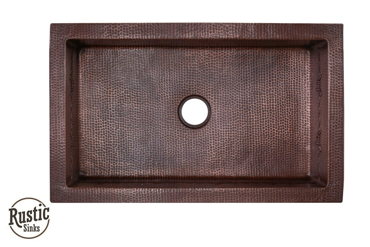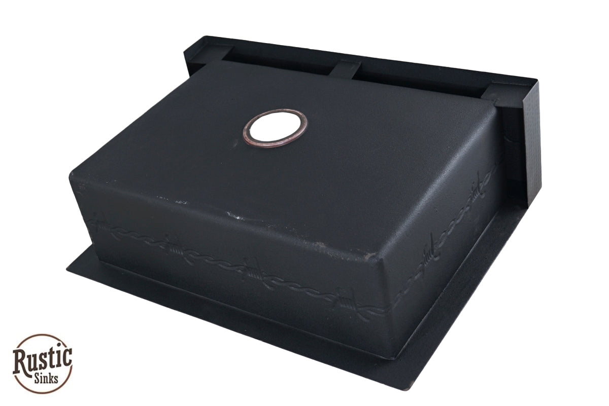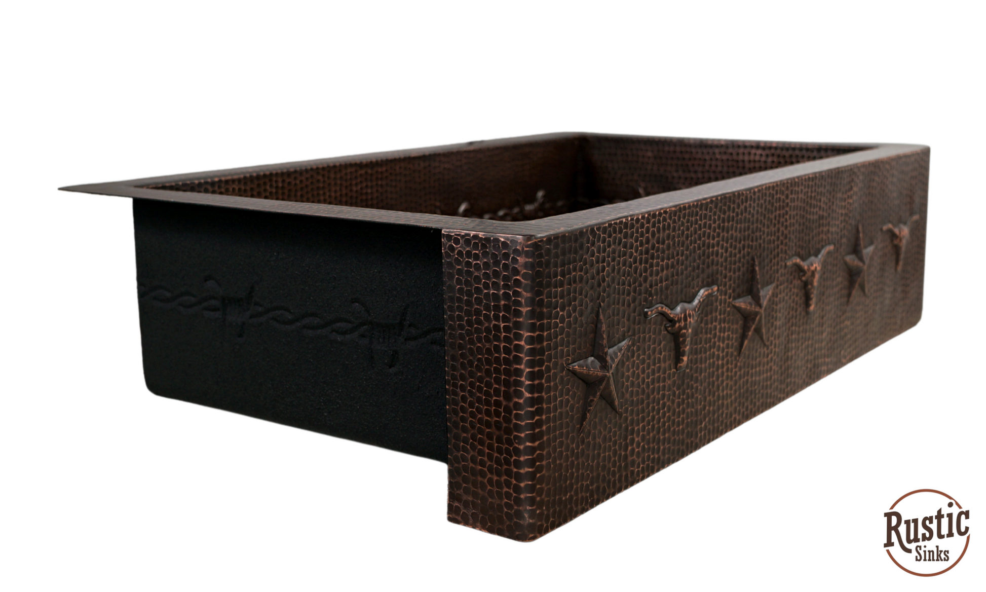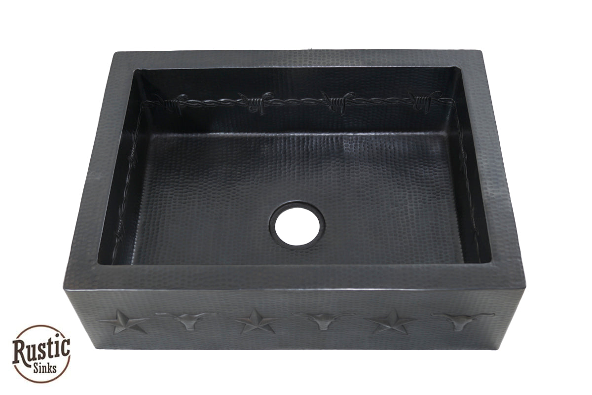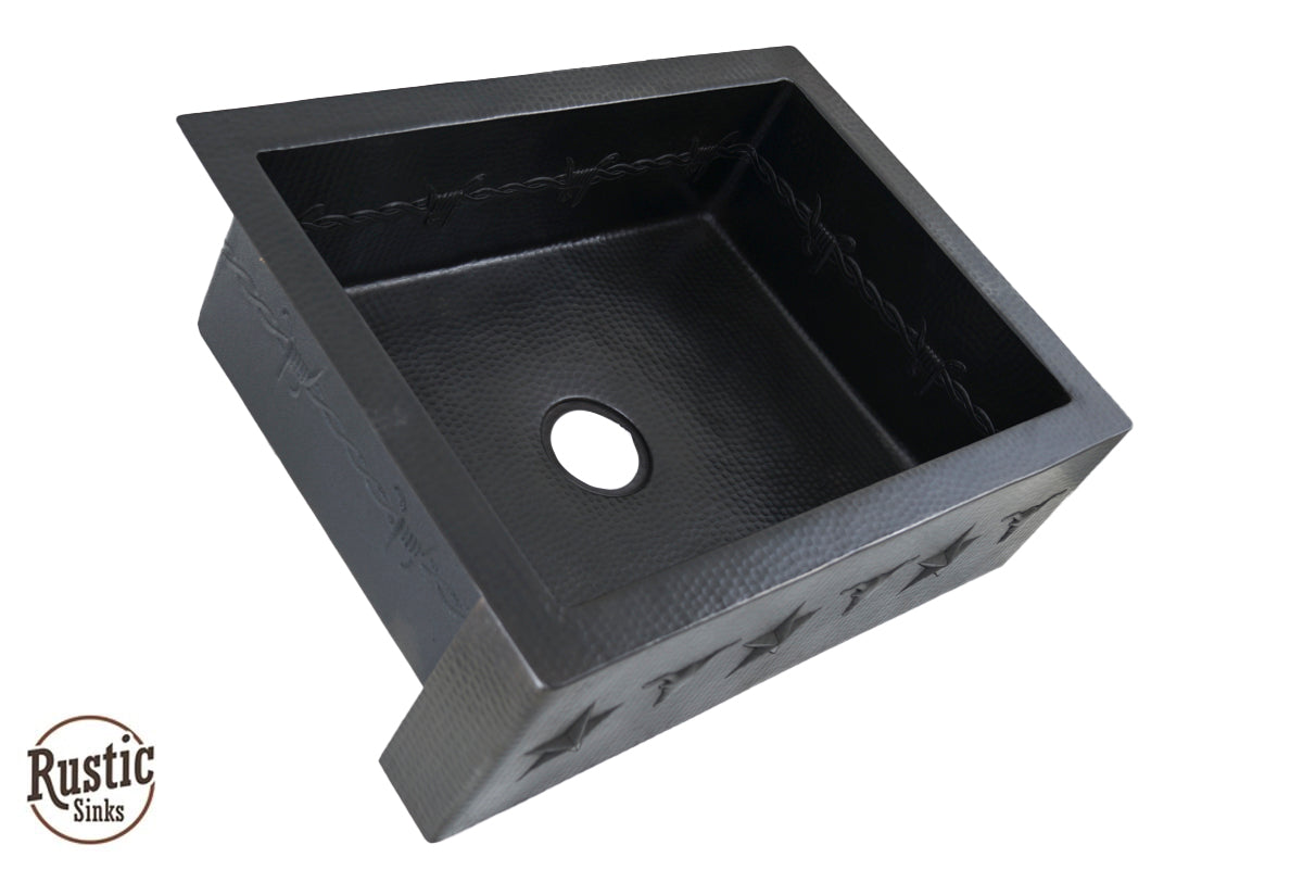 A great value for this copper sink with rustic style western design of stars, barbwire, and longhorns are lined across the front flat apron and around the interior 9 inch bowl. Add the warmest of copper to your kitchen for a unique custom look. With so many colors to choose from, you will be designing a special farmhouse sink. Due to the handmade nature of this sink, we recommend receiving the sink before making cabinet cuts. Shown in order, Brown Light, Dark Light and Black Copper. See Copper Colors here