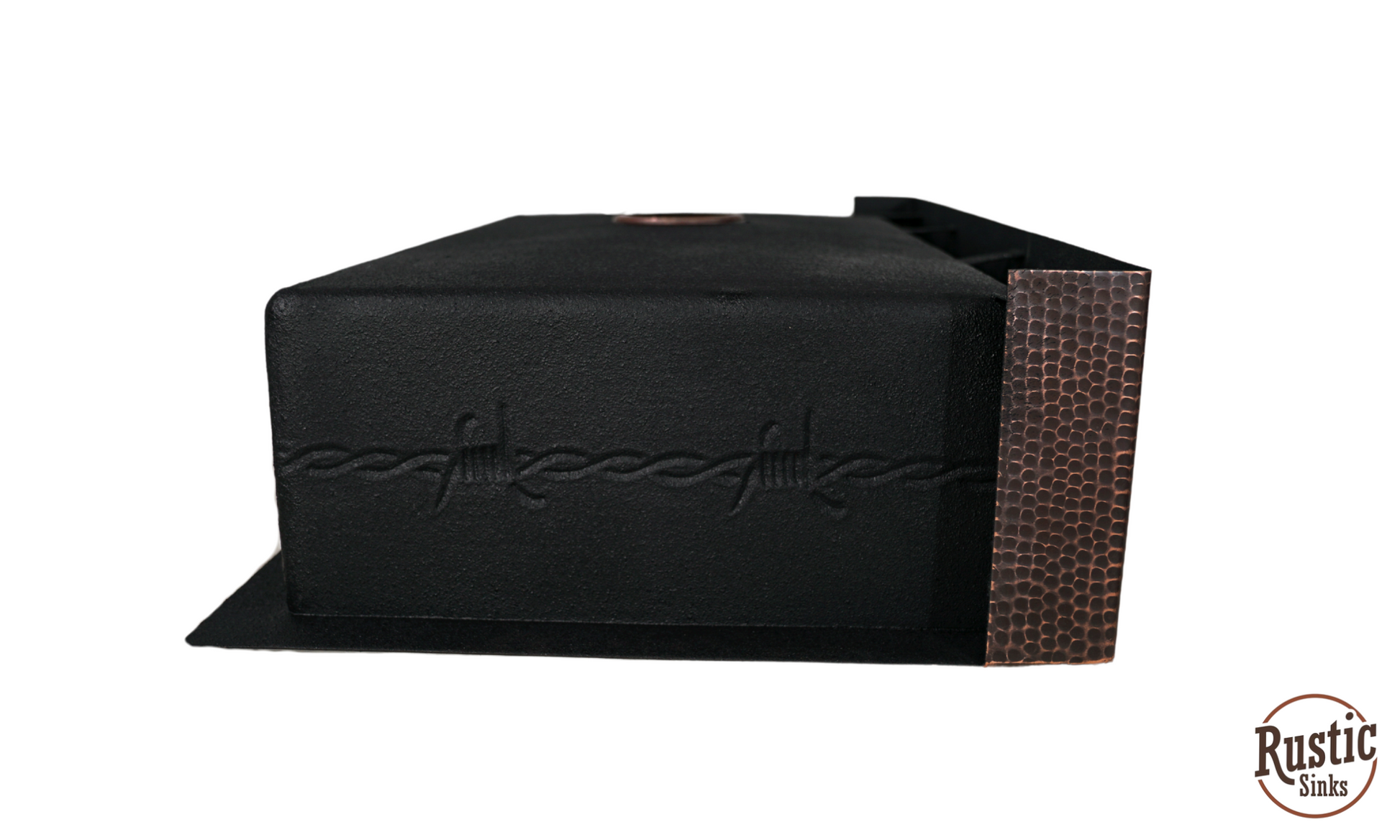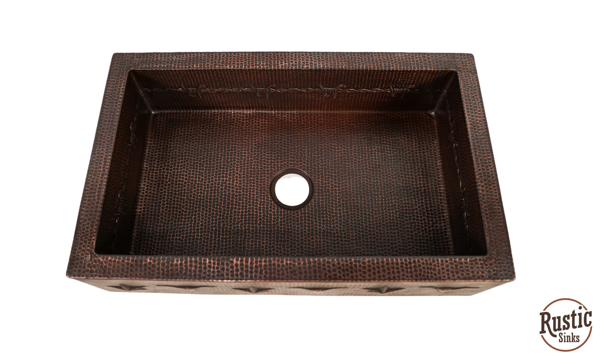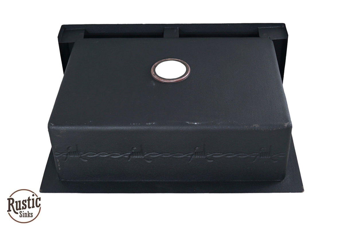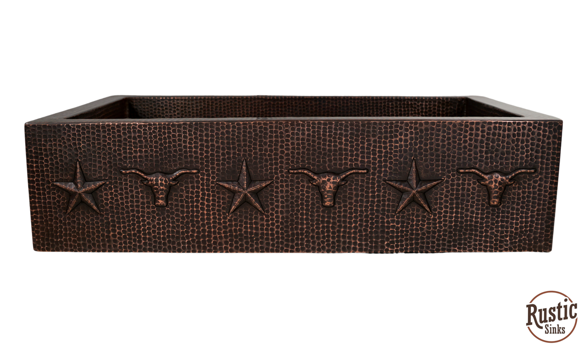 A great value for this copper sink with rustic style western design of stars, barbwire, and longhorns are lined across the front flat apron and around the interior 9 inch bowl. Add the warmest of copper to your kitchen for a unique custom look. With so many colors to choose from, you will be designing a special farmhouse sink. Due to the handmade nature of this sink, we recommend receiving the sink before making cabinet cuts. Shown in order, Brown Light, Dark Light and Black Copper. See Copper Colors here
