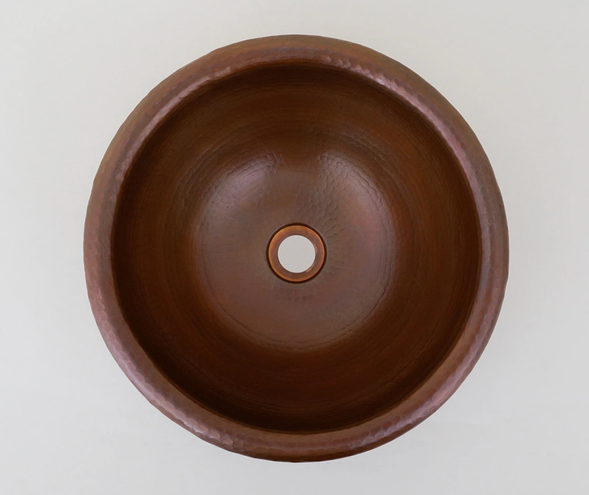 This classic style in a 10, 15 or 17 inch round copper sink has a hammered finish. The 1 inch rounded edge allowing for drop in mount installation. A copper bath sink will be a beautiful choice in any bathroom. See Copper Colors here