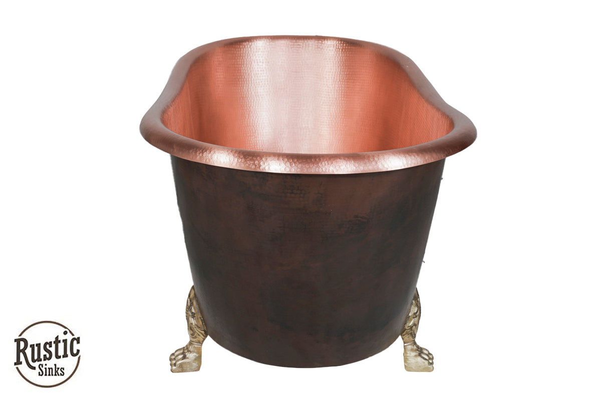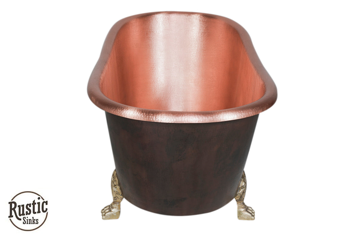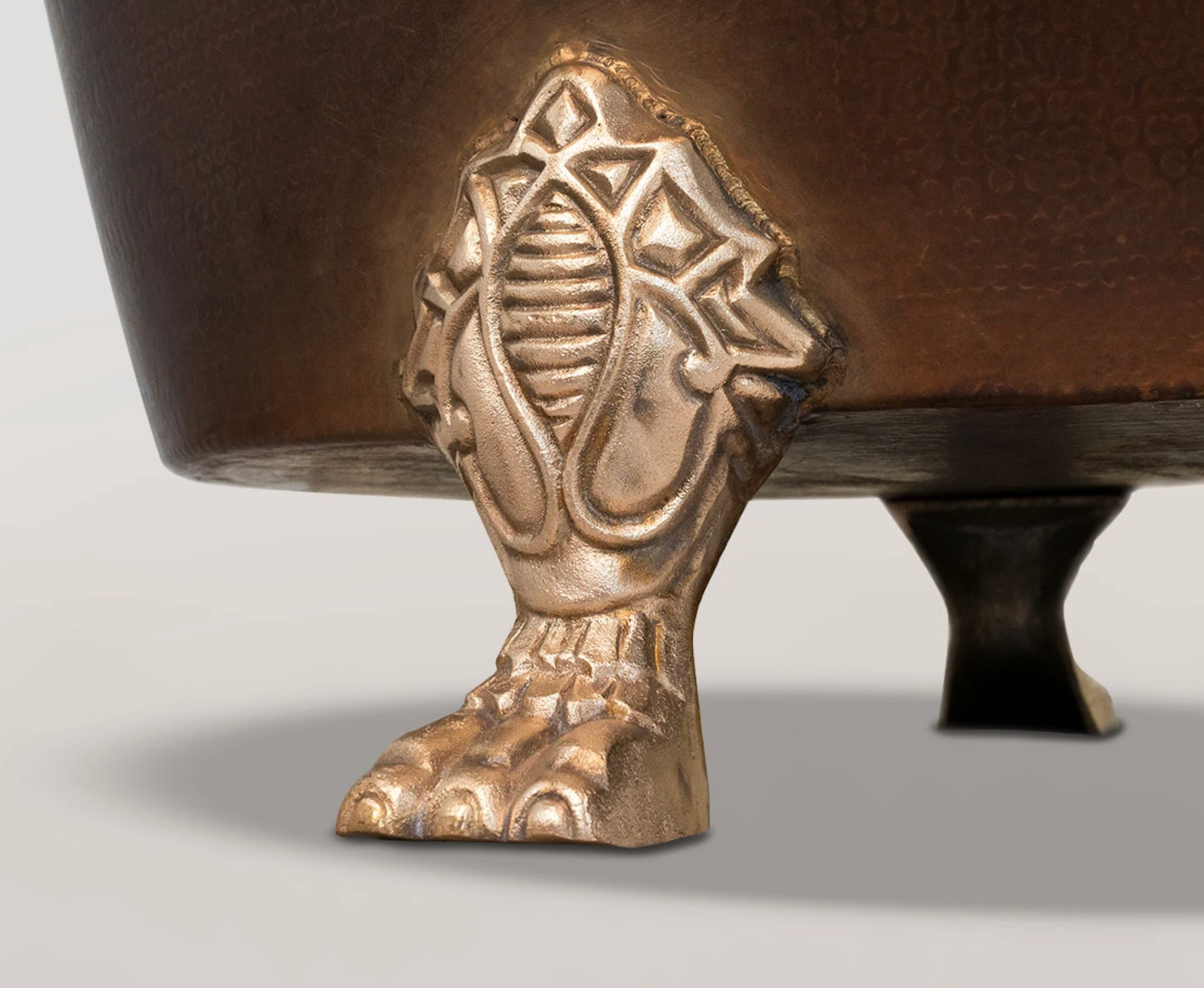 This traditional style clawfoot bathtub will become the center piece of your bathroom. The dark copper bathtub has beautifully detailed lion feet. Shown in a custom Dark Copper with Matte Copper interior.All color options are exterior and all will have a matte copper interior as shown. Let us know if you would like holes cut for a deck mount faucet and/or overflow.