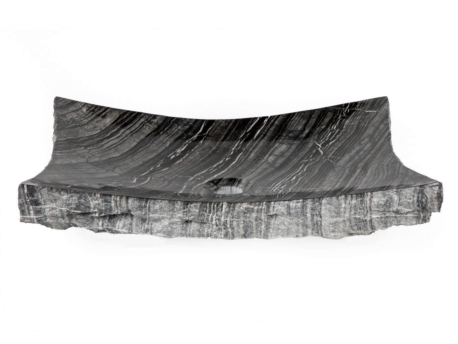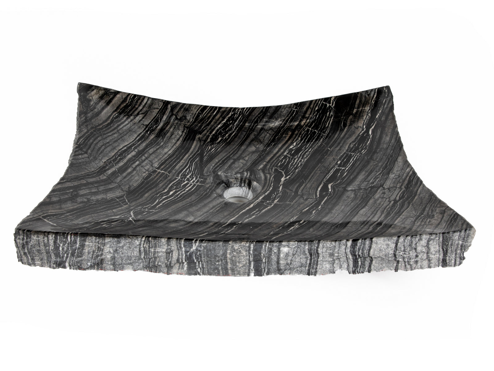 Tranquility and strength work together in this large Zen above the counter vessel sink in wooden black marble. This version of the popular Zen sink is polished on the interior and chiseled on the exterior. The rough exterior of this stone sink provides a rustic, rough and natural look while the polished interior provides a functional and beautiful stone sink surface. The free flowing lines of this sink will provide your bathroom with a Zen like feeling you can usually only find at your favorite spa. We recommend that you also purchase a drain with your stone sink in the same finish of your faucet.